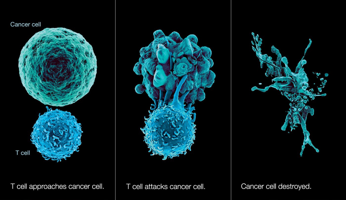 Drugs called checkpoint inhibitors are the most widely used form of immunotherapy for cancer. They block a mechanism that cancer cells use to shut down the immune system. This frees killer T-cells — a critically important part of the immune system — to attack the tumor. Four checkpoint inhibitors have been approved by the Food and Drug Administration and are on the market. They are given intravenously.